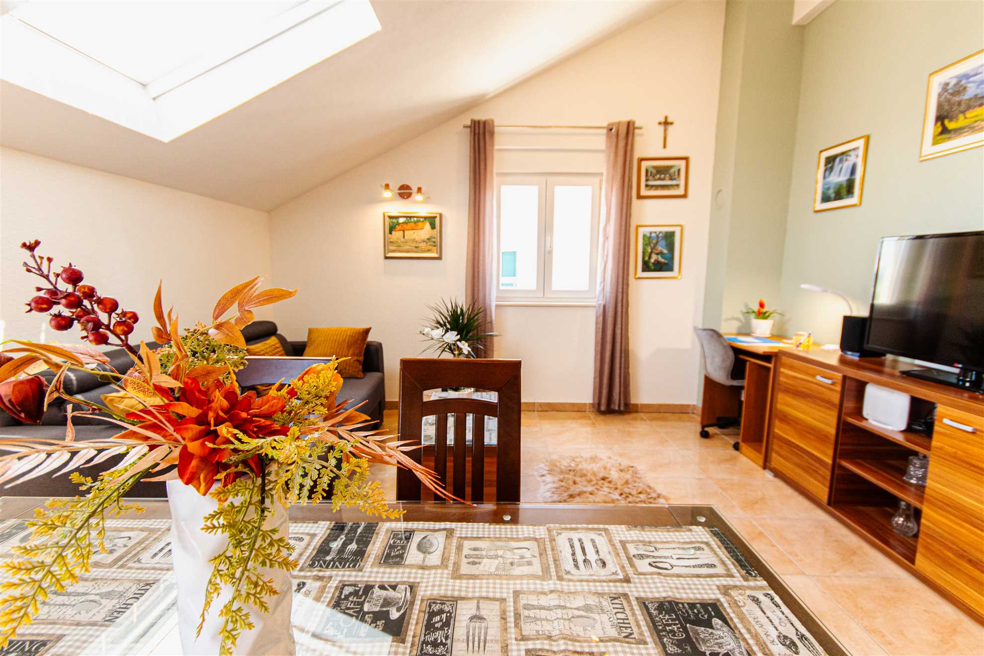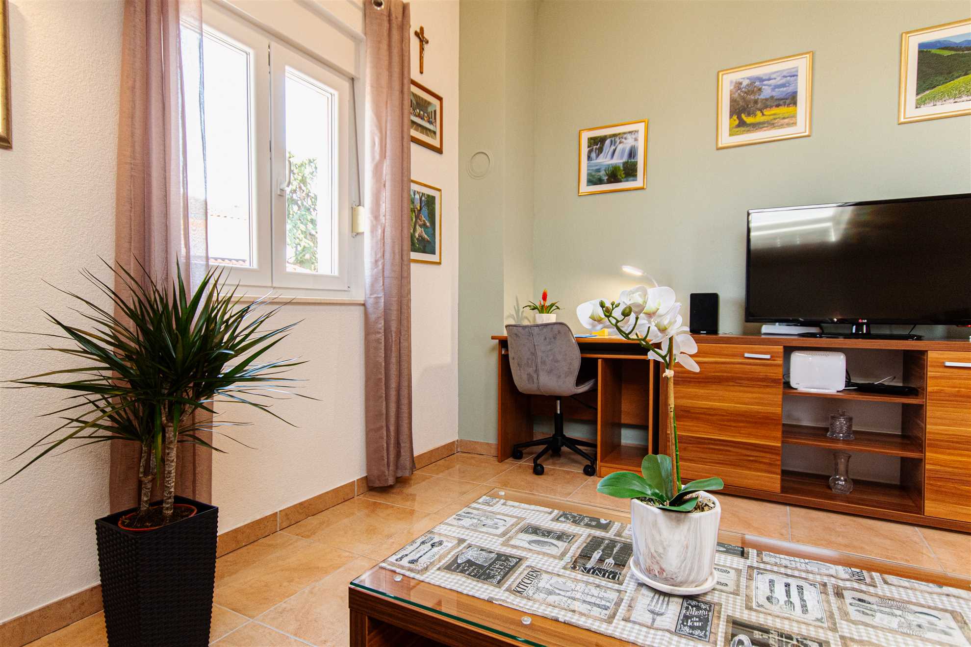 🛋 Cozy living room – features a comfortable couch, cable TV, excellent WiFi, and a dedicated workspace with a table and chair.