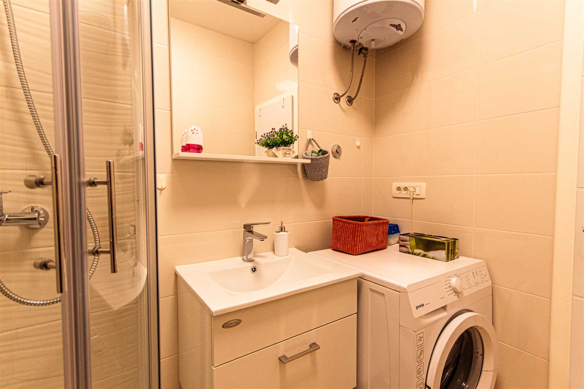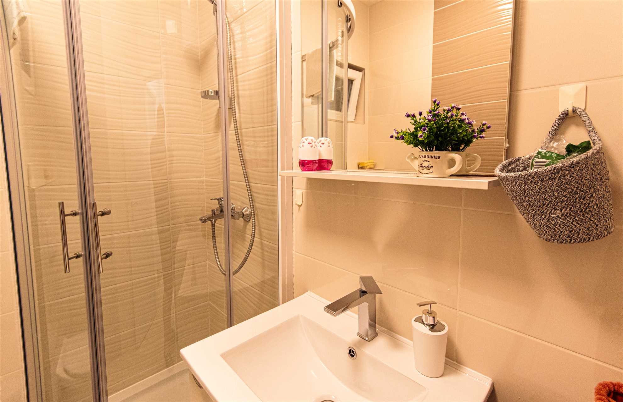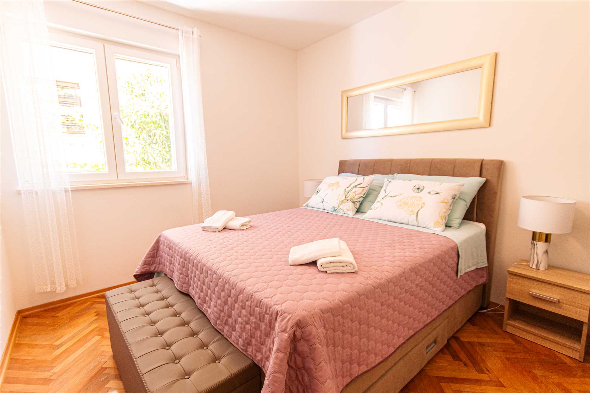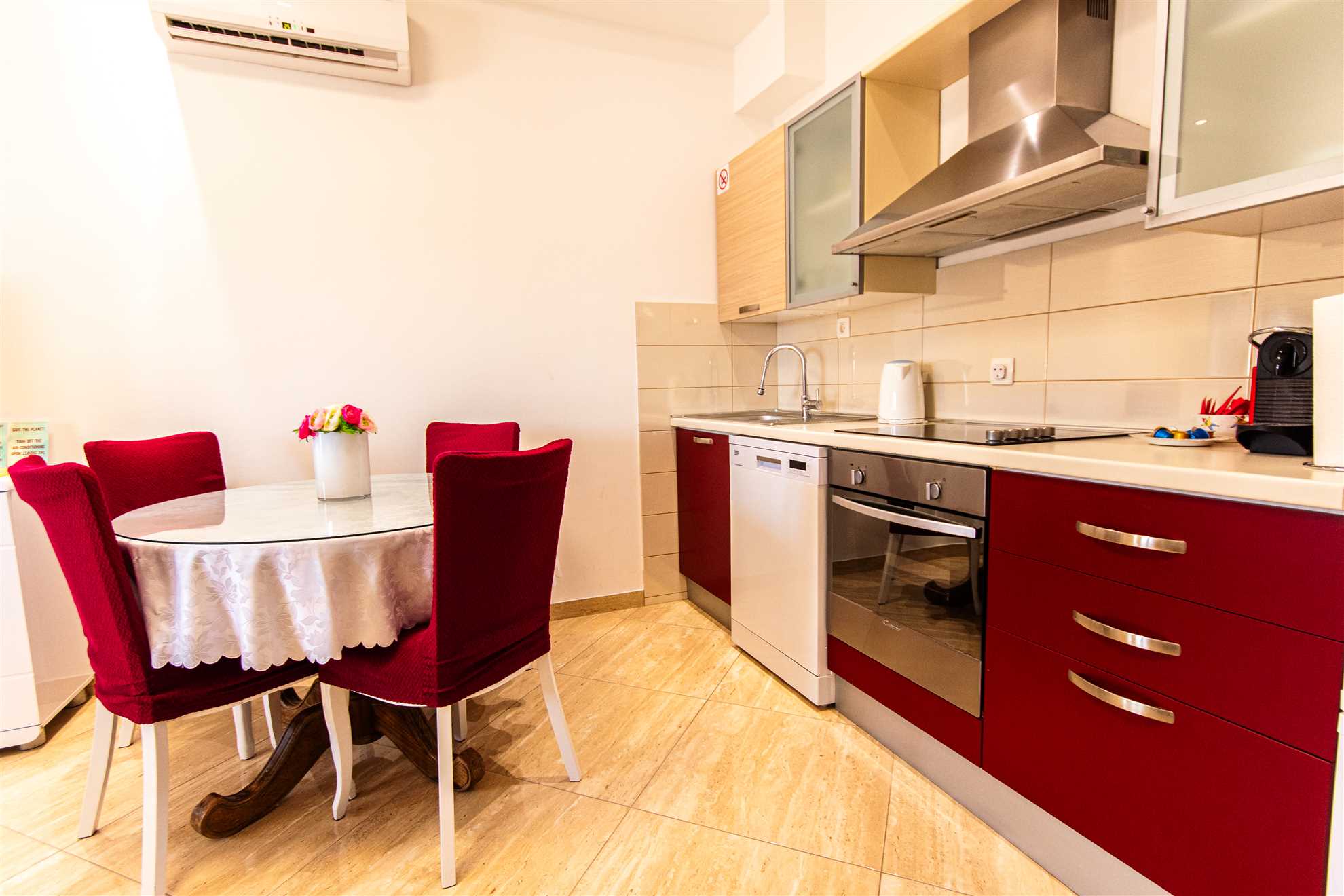 Apartment consists of large kitchen: four hotplates, oven, refrigerator and freezer, dishwasher, Nespresso machine,large sofa in the living room and cable tv. It has one bedroom with double bed and other bedroom with two single beds, large bathroom with glass enclosed shower.